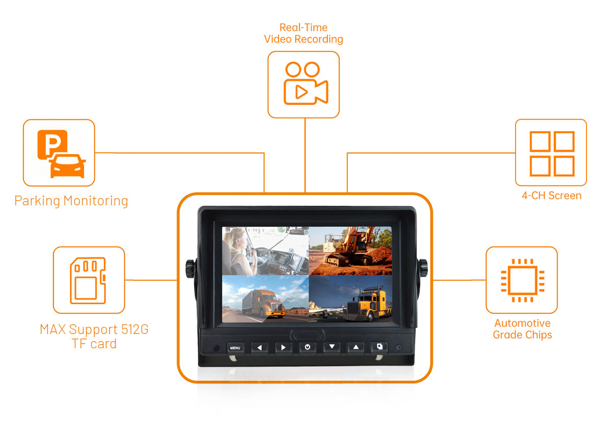 AI Warning: AI camera sends out a warning signal, triggering the monitor’s built-in buzzer alarm and LED strobe light alarm on the monitor to remind the driver to pay attention to safety.
