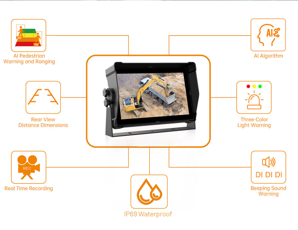 Due to the high concentration required by vehicle and machinery operators, they often do not have the time to constantly monitor the vehicle’s rearview monitor image screen. AI pedestrian vehicle detecting and warning camera to capture personnel in the monitoring area in real time, It sends warning signals that trigger the built-in buzzer alarm and LED strobe light alerts on the monitor to remind the driver.