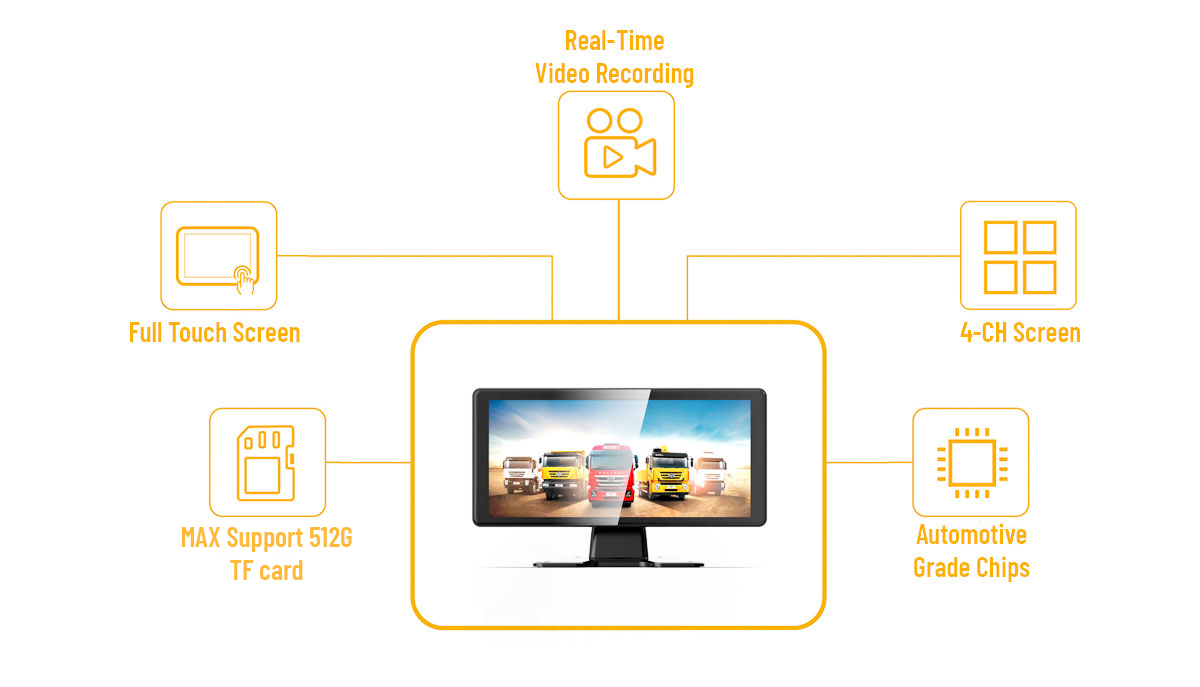 ▪AI Warning: AI camera sends out a warning signal, triggering the monitor’s built-in buzzer alarm and LED strobe light alarm on the monitor to remind the driver to pay attention to safety.