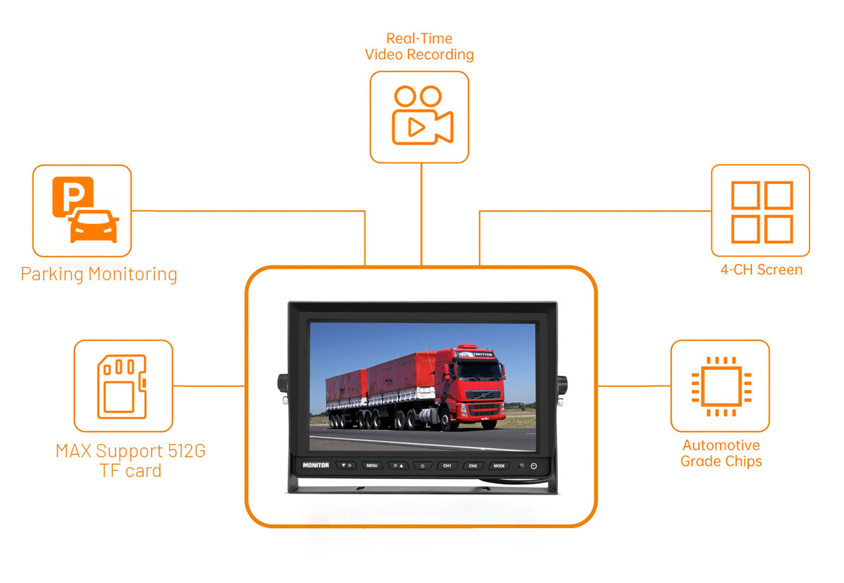 ▪AI Warning: AI camera sends out a warning signal, triggering the monitor’s built-in buzzer alarm and LED strobe light alarm on the monitor to remind the driver to pay attention to safety.