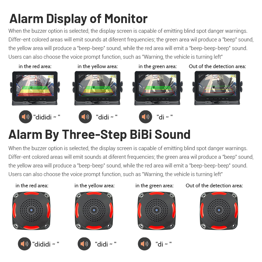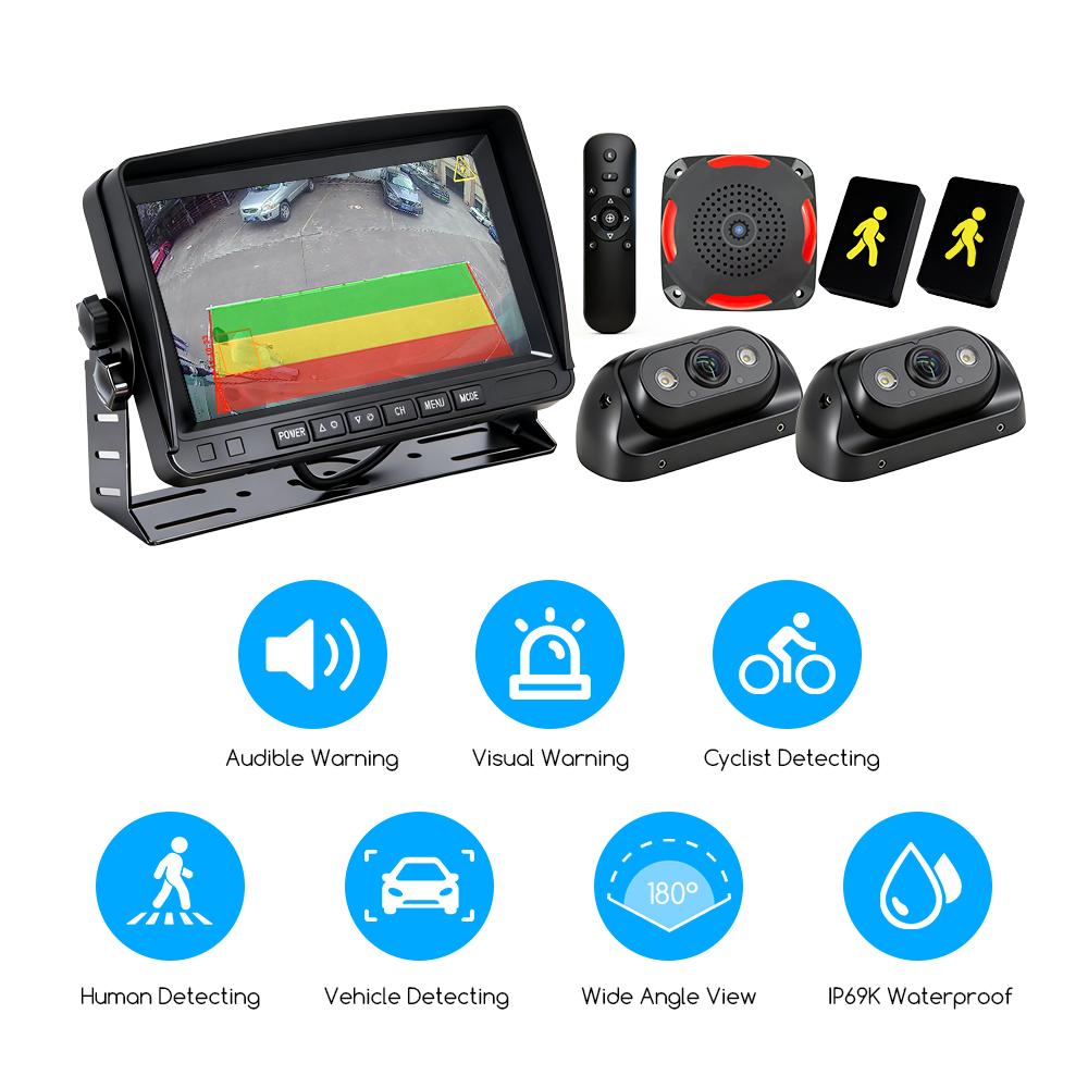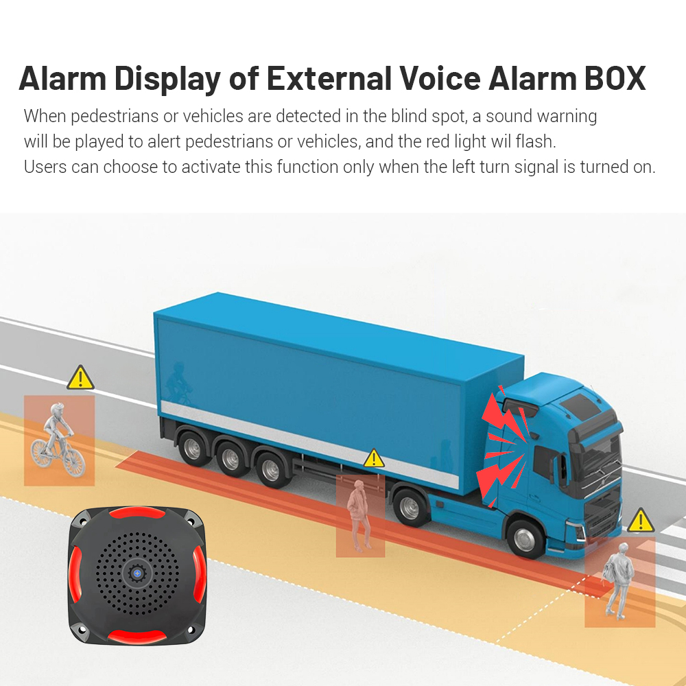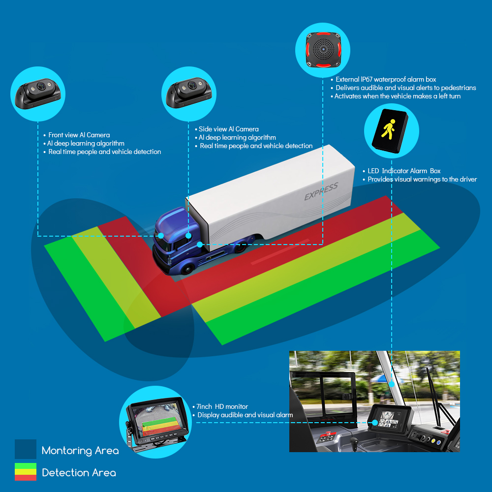 BSIS meets the standards of UN ECE R151, containing a LED sound and light alarm box, an AI side camera, an external sound and light alarm box, and helps to warn the driver of possible collisions with Vulnerable Road Users (VRUs) including pedestrians and cyclists in the near side of the vehicle.