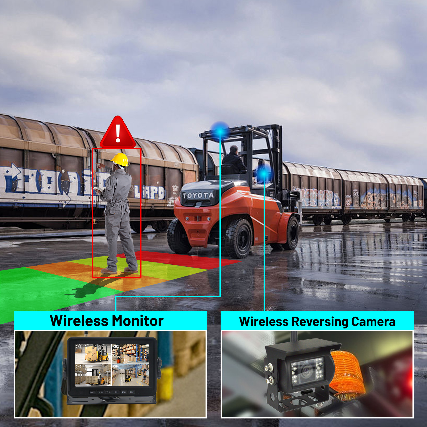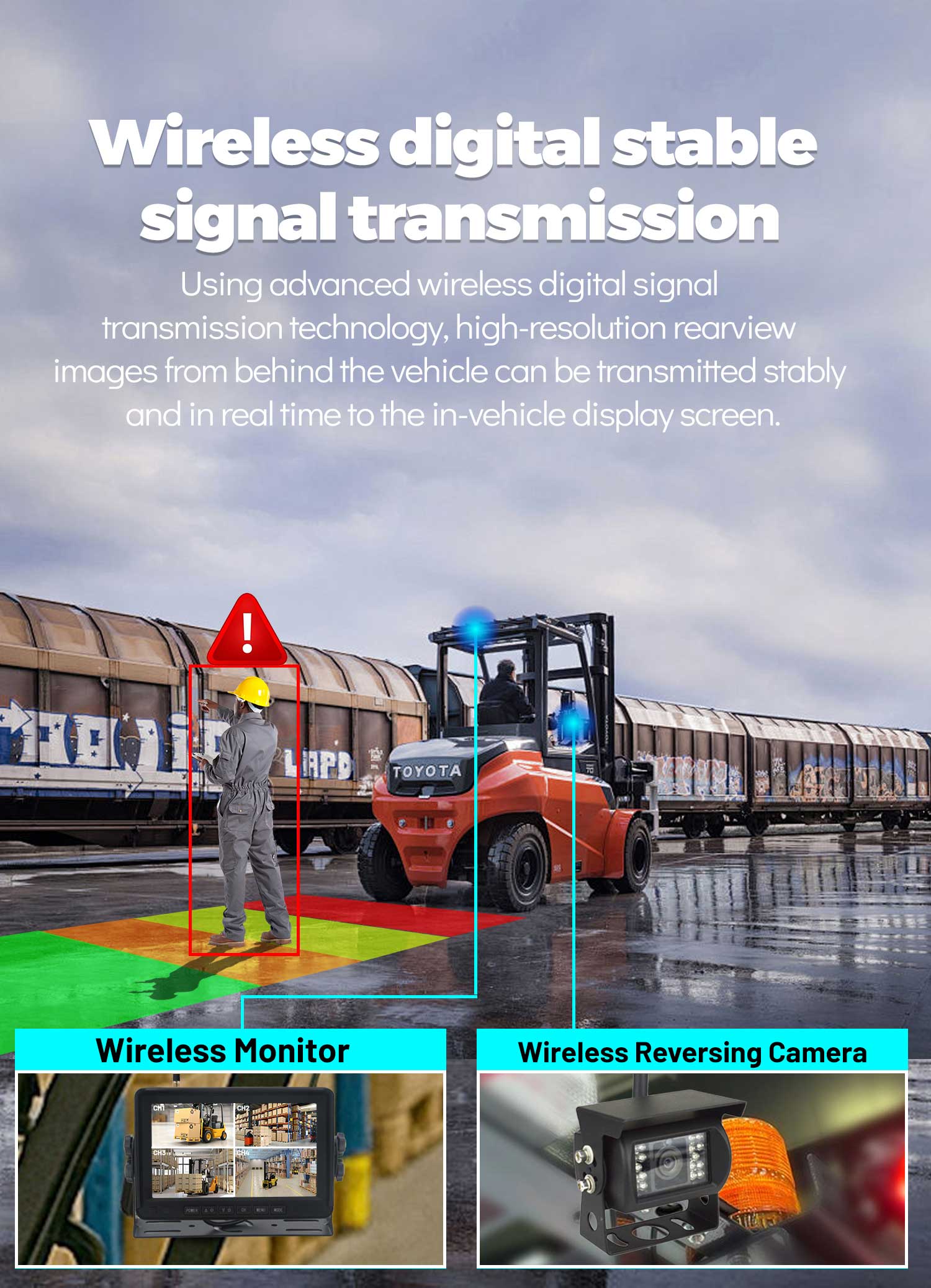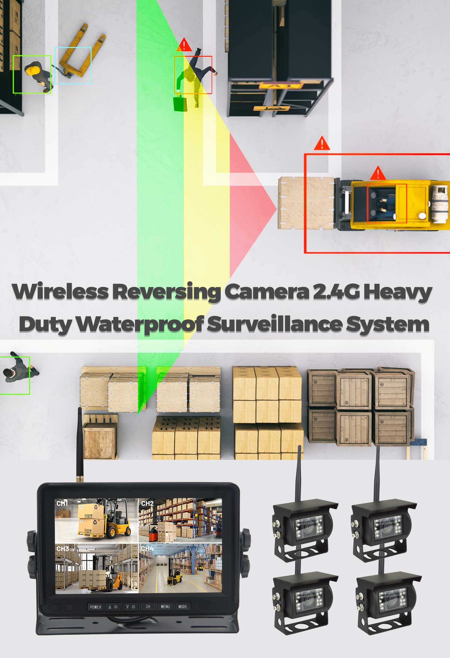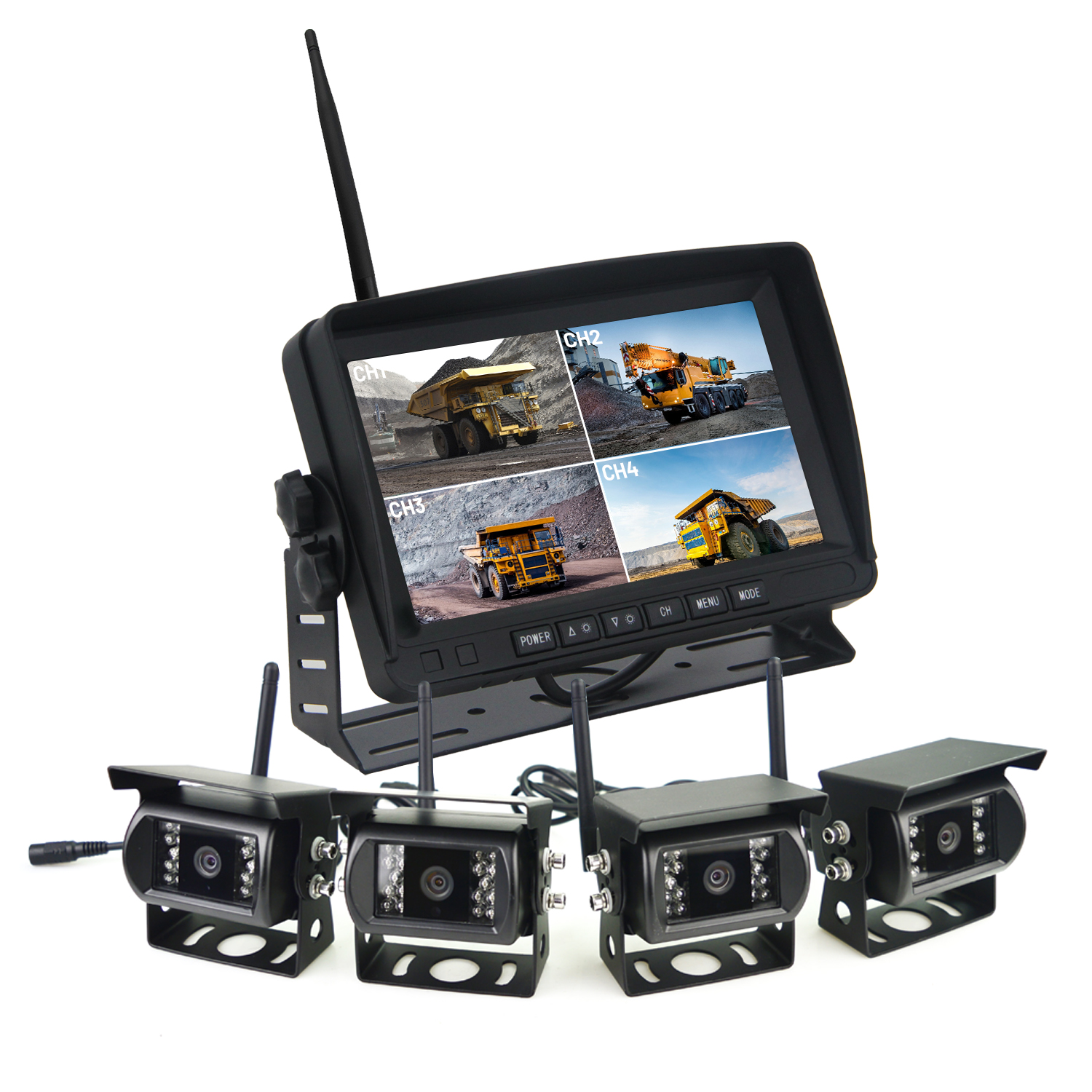 1. Heavy Duty Digital wireless video camera surveillance system 4 channels four pictures used in the container trailers, tank trailers, cranes, and other construction vehicles, without cables through the routing application, you can monitor four screen images and video playback screen.