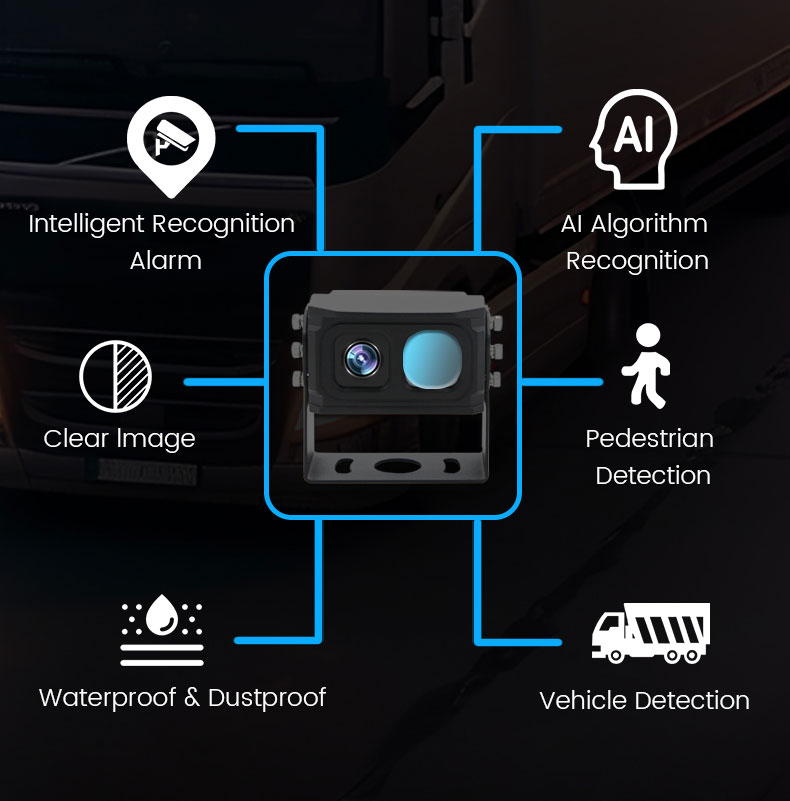 [Pedestrian & Vehicle & Non-motorized Vehicle Detection]Built-in AI algorithm can identify pedestrians, vehicles and non-motorized vehicle such as cyclists, electric bikers, and pedestrians on foot and provide audio warning function; Support customized alarm strategies to meet the needs of customers.